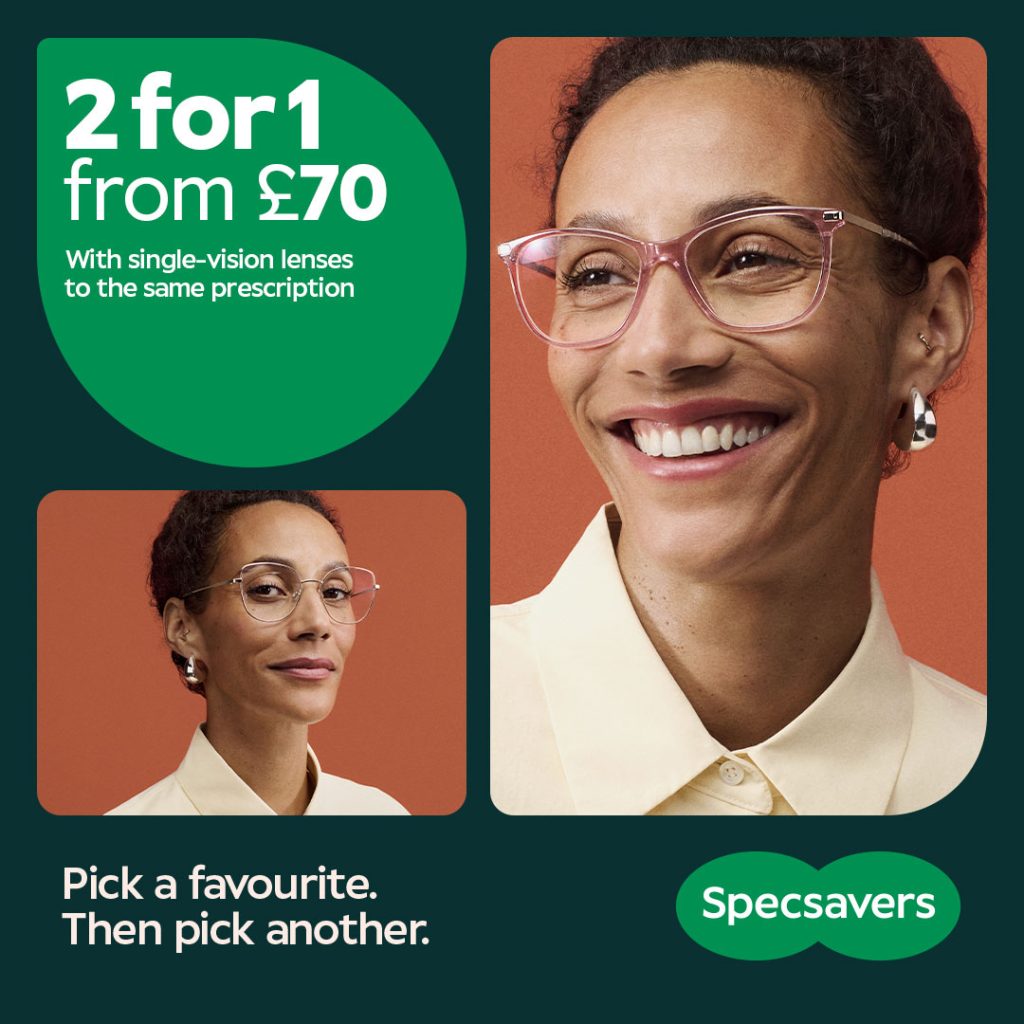 At Specsavers Jackson Square, you can choose two styles with their 2 for 1 offer from £70, including single-vision lenses...